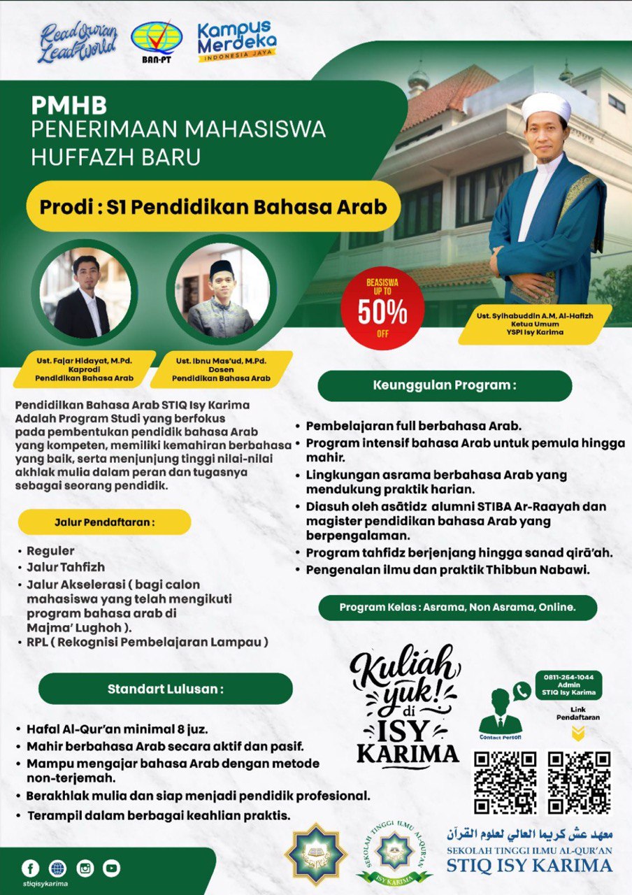 STIQ Isy Karima membuka Penerimaan Mahasiswa Huffazh Baru (PMHB) untuk Program Studi S1 Pendidikan Bahasa Arab. Program ini dirancang khusus untuk mencetak pendidik bahasa Arab yang kompeten, mahir dalam berbahasa secara aktif, serta memiliki akhlak mulia yang menjunjung tinggi nilai-nilai keislaman dalam kehidupan dan pengabdiannya sebagai seorang pendidik profesional.