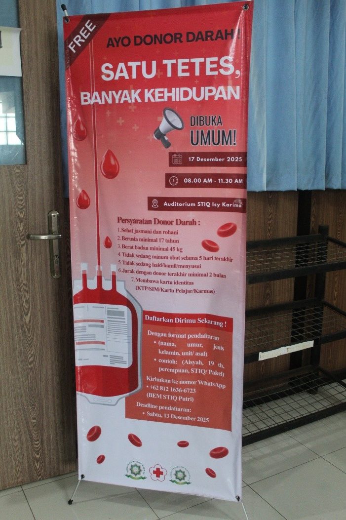 Kepedulian terhadap sesama kembali diwujudkan melalui kegiatan Donor Darah bertema “Satu Tetes, Banyak Kehidupan” yang diinisiasi oleh Badan Eksekutif Mahasiswa STIQ Isy Karima. Kegiatan ini menjadi bagian dari aksi kemanusiaan yang selaras dengan karakter lembaga yang menjunjung tinggi aqidah salimah, ibadah shahihah, akhlaqul karimah, dan jasadul qowiyyah.